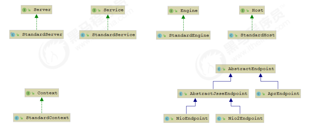 Server、Service、Engine、Host、Context都是接口, 下图中罗列了这些接口的默认 实现类。