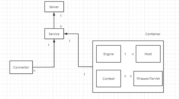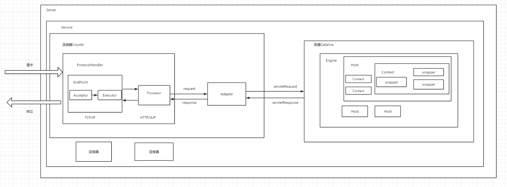 Service:在服务器中可以有多个 Service,只不过在我们常用的这套 Catalina 容器的Tomcat 中只包含一个 Service,在 Service 中包含连接器和容器。一个完整的 Service 才能完成对请求的接收和处理。