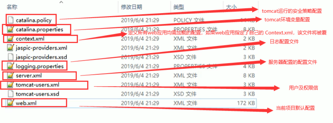 其中最重要的就是 server.xml,主要配置了 tomcat 容器的所有配置。下面来看一下其中有哪些配置。