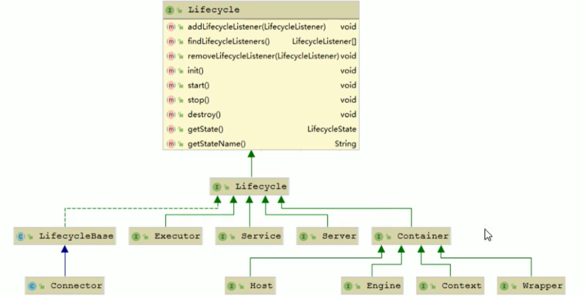 这些组件均存在初始化、启动、停止等周期方法,所以 Tomcat 设计了一个 LifeCycle 接口,用于定义这些组件生命周期中需要执行的共同方法,这些组件实现类都实现了这个接口。