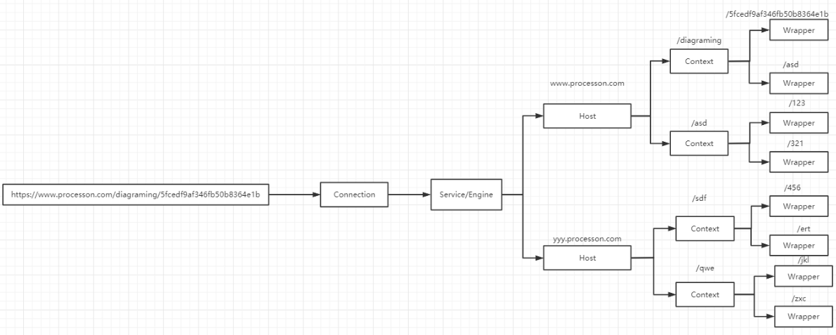 4)Mapper组件根据请求行的URL值和请求头的Host值匹配由哪个Host容器、Context容器、Wrapper容器处理请求。
