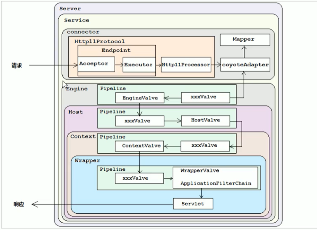 当一个请求进入 Tomcat 时,执行情况如下( 因为 Tomcat 只有一个 Service,所以下面就将 Service 和 Engine 写在同一个框中):