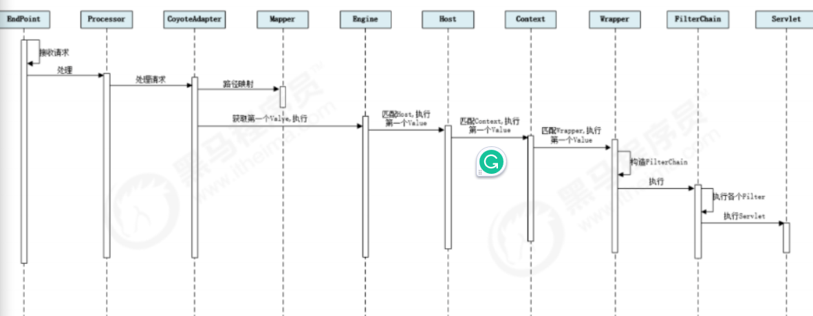9)Wrapper容器的管道开始处理,流程类似,最后执行 Wrapper容器对应的Servlet对象的处理方法。