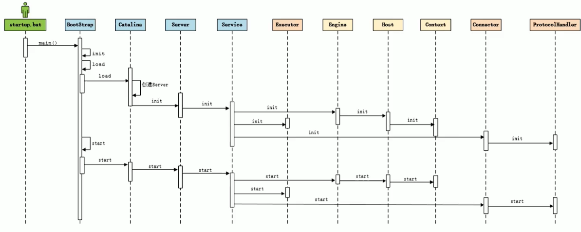 加载Tomcat的配置文件,初始化容器组件 ,监听对应的端口号, 准备接受客户端请求 。