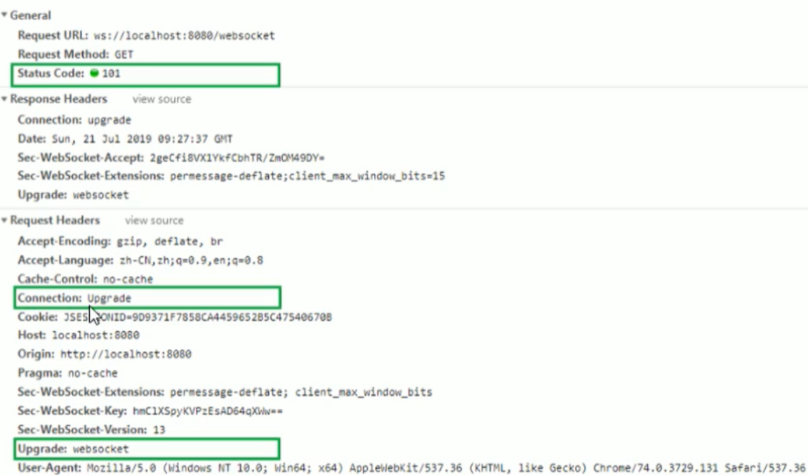 请求头 Connection: Upgrade 和 请求头 Upgrade: websocket 表示这个连接将要被转换为WebSocket 连接;