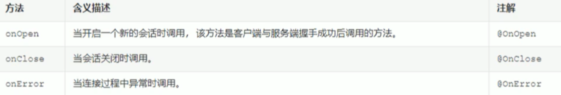 2). 第二种是注解式, 即定义一个POJO, 并添加 @ServerEndpoint相关注解。Endpoint实例在WebSocket握手时创建,并在客户端与服务端链接过程中有效,最后在链接关闭时结束。在Endpoint接口中明确定义了与其生命周期相关的方法, 规范实现者确保生命周期的各个阶段调用实例的相关方法。生命周期方法如下:
