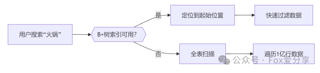 LIKE '%火锅%'需要遍历所有可能的字符组合(如“重庆火锅”“火锅店”),无法通过前缀定位,相当于随机查找。