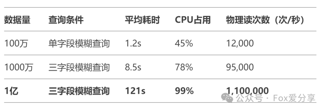 LIKE '%xx%'无法利用B+树索引(只有LIKE 'xx%'可能命中) - 合并扫描灾难:三个索引合并查询需要回表30万次
