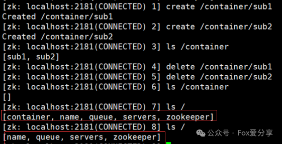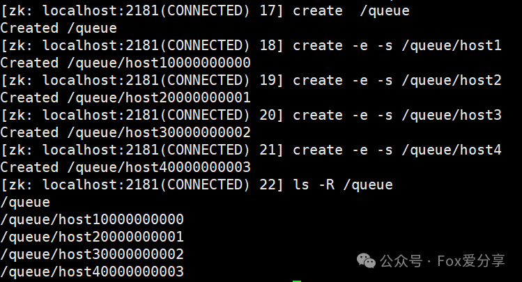 1 | #创建持久节点create /servers xxx#创建临时节点create -e /servers/host xxx#创建临时有序节点create -e -s /servers/host xxx#创建容器节点create -c /container xxx# 创建ttl节点create -t 10 /ttl |
