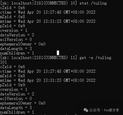 表示该节点的子节点列表最后一次修改的事务ID,添加子节点或删除子节点就会影响子节点列表,但是修改子节点的数据内容则不影响该ID(注意: 只有子节点列表变更了才会变更pzxid,子节点内容变更不会影响pzxid)