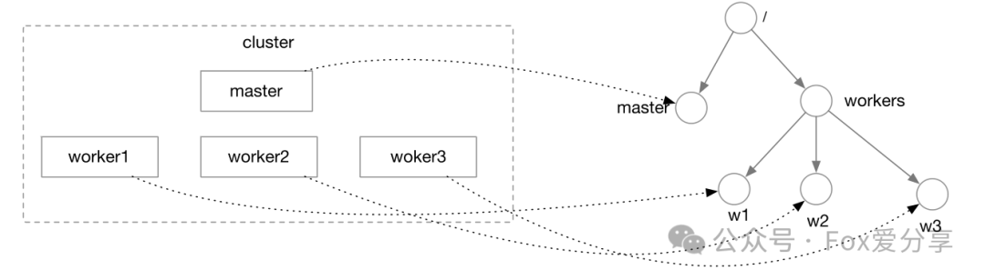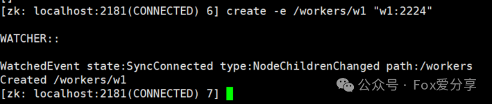 1 | master服务create /workers#让master服务监控/workers下的子节点ls -w /workers#worker1create -e /workers/w1 "w1:2224" #创建子节点,master服务会收到子节点变化通知#master服务ls -w /workers#worker2create -e /workers/w2 "w2:2224" #创建子节点,master服务会收到子节点变化通知#master服务ls -w /workers#worker2quit #worker2退出,master服务会收到子节点变化通知 |