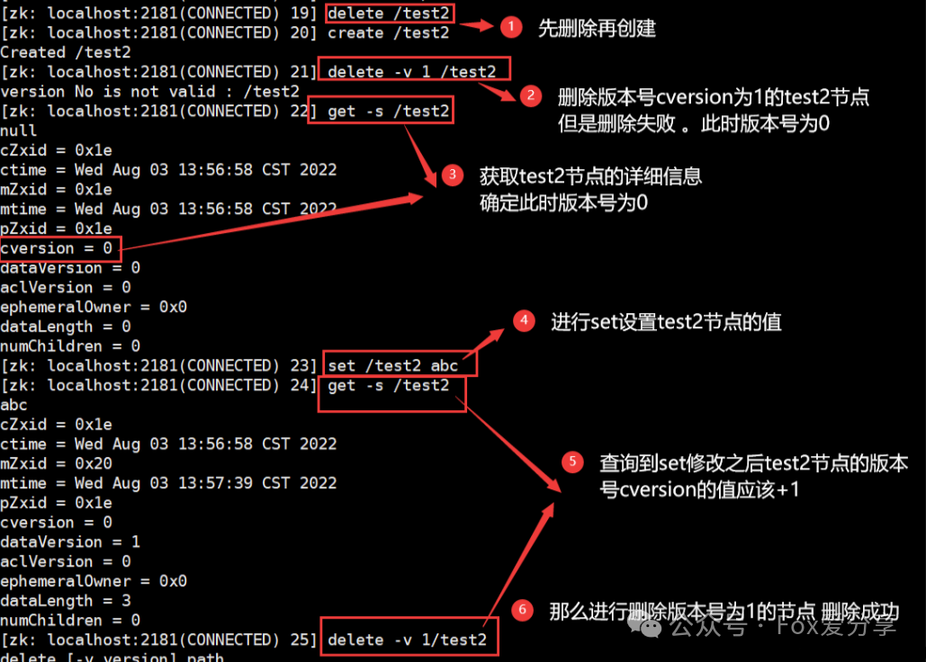 | delete [-v version] path | 删除某一节点,只能删除无子节点的节点。-v: 表示节点版本号 |