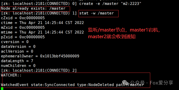 1 | master1create -e /master "m1:2223" #master2create -e /master "m2:2223" # /master已经存在,创建失败Node already exists: /master#监听/master节点stat -w /master#当master2收到/master节点删除通知后可以再次发起创建节点操作create -e /master "m2:2223" |